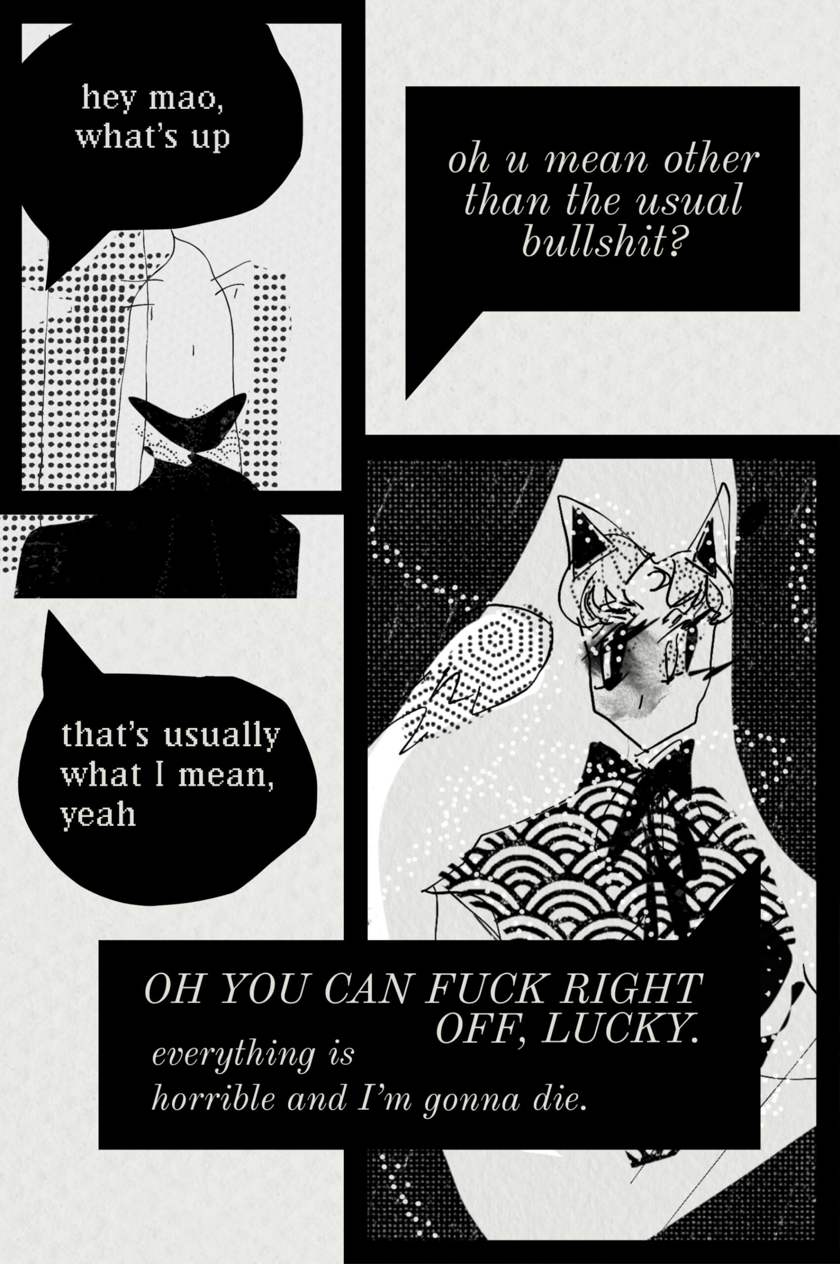 LUCKY: like what, mao-chan? I'm afraid you'll have to be a little more specific. also, your hair looks nice today. like maybe you washed it in the blood of some innocents or whatever.